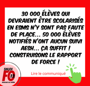 30 000 élèves qui devraient être scolarisés en ESMS n’y sont pas faute de place… 50 000 élèves notifiés n’ont aucun suivi AESH… Ça suffit ! Construisons le rapport de force !