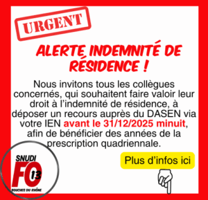 Étant toujours en attente d’une date d’audience pour le jugement, nous invitons tous les collègues, qui souhaitent faire valoir leur droit à l’indemnité de résidence, à déposer un recours (y compris ceux qui l’ont déjà fait en 2024) auprès du DASEN via votre IEN avant le 31/12/2025, minuit, afin de bénéficier des années de la prescription quadriennale.