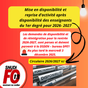 Dans un souci d’efficience des opérations de mobilité, les demandes de disponibilité et de réintégration pour la rentrée 2026-2027, doivent parvenir à la DSDEN – bureau DPE1