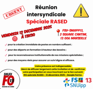 Nos organisations syndicales FSU-SNUipp13 et SNUDI-FO13 organisent une réunion urgente destinée à l’ensemble des personnels des RASED des Bouches-du-Rhône.
